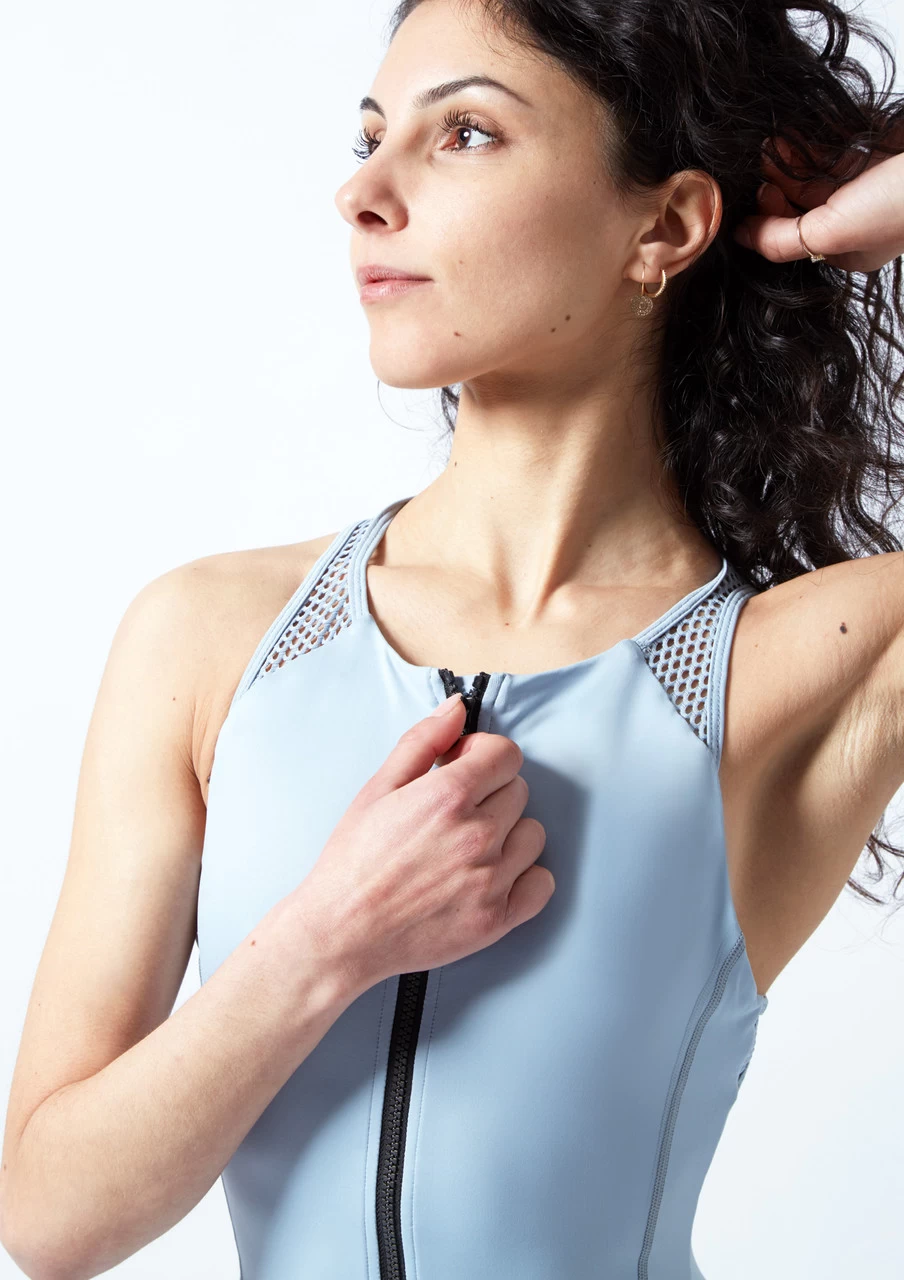 A sporty style catsuit with fun mesh detailing. Featuring a zip-up front that is easily adjustable to style how you wish. The racer-style front and back shapes a flattering sporty silhouette. This is complemented by a high waistband and leg paneling. We love the open mesh back design. A versatile catsuit that can be worn for dance, yoga or as activewear.