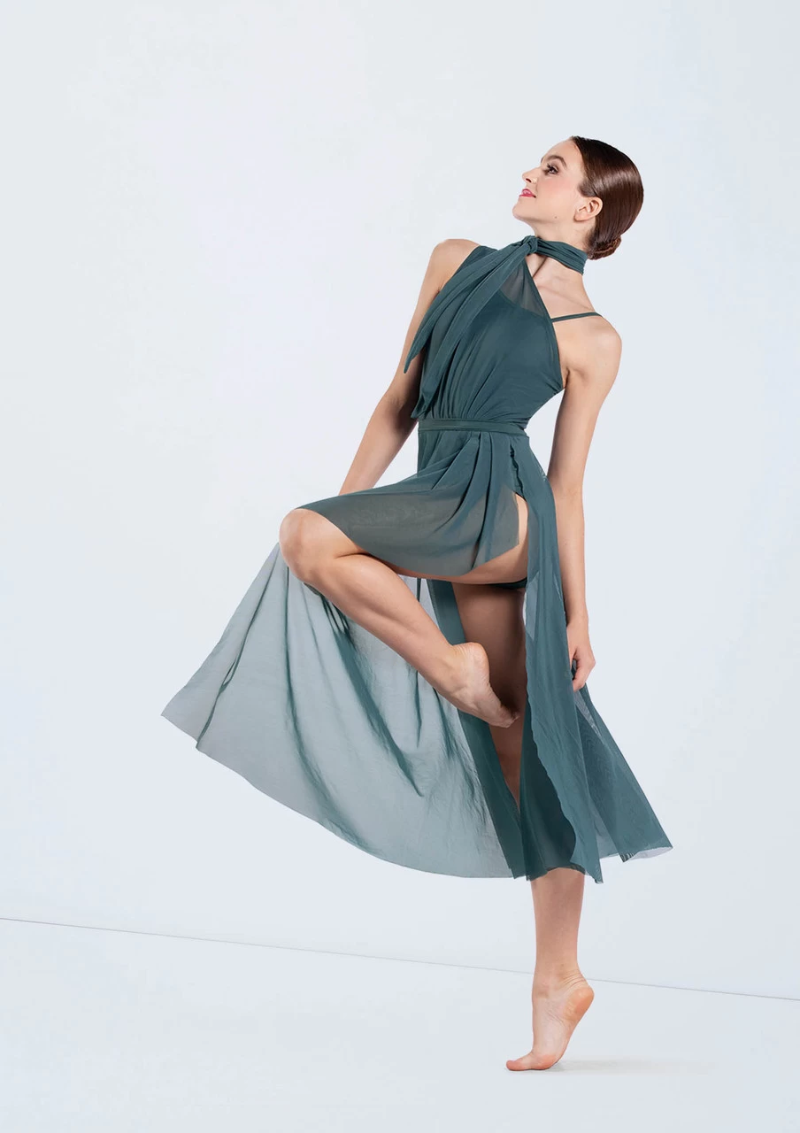 -One shoulder style with detachable tie at the mock neck